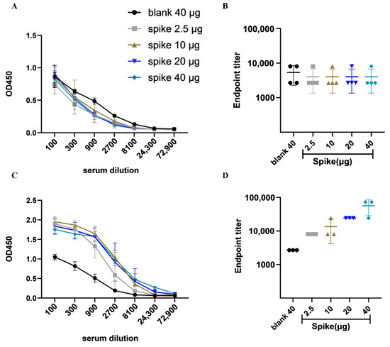 Humoral immune response to SARS-CoV-2 antigen in vaccinated BALB/c mice. (A) The antibody titer in sera of immunized mice after the first vaccination. (B) Endpoint titer in mice after the first immunization. (C) The antibody titer in mice after the third immunization. (D) Endpoint titer in mice after the third vaccination.