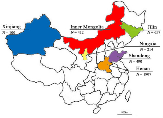 Geographic locations for specimen collection: The different provinces are marked in different colors with the number of collected samples. Blue: Xinjiang; red: Inner Mongolia; green: Jilin; yellow: Ningxia; purple: Shandong; orange: Henan. N represents the number of samples collected.