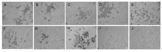 Immunoreactions of novel caprine/ovine enterovirus isolates to CEV-JL14. Seven representative novel caprine/ovine enterovirus strains were characterized by IPMA. Immunoreactions of the isolated viral strains to a monoclonal antibody against CEV-JL14-VP1 are shown. Strong reactions were revealed in the cells infected with NX-DR26, NMG-F37, SD-S68, JL-LS34, JL-LS127, JL-LS165, JL-LS174, and CEV-JL14 (A–H, respectively), while no reaction was observed for SD-S67 virus and normal Vero cells (I,J). Panels A–I represent the isolates NX-DR26, NMG-F37, SD-S68, JL-LS34, JL-LS127, JL-LS165, JL-LS174, CEV-JL14, and SD-S67, respectively. J represents the non-infected cell control. Bar = 20 μm.