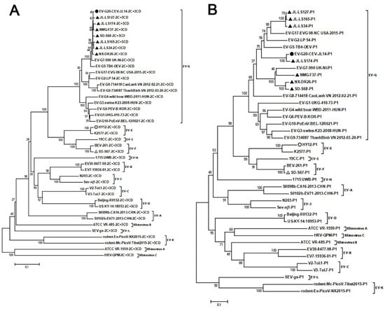 Phylogenetic analyses for the novel caprine/ovine enterovirus strains. The reference sequences include the representative sequences of all known EV-G types and representative sequences of all 15 species of the Enterovirus genus as outgroup sequences. The amino acid sequences of 2C+3CD (A) and P1 (B) were used to construct the phylogenetic tree using the NJ method with 1000 bootstrap replications. Bootstrap values of > 50 are shown at the nodes. The scale bar represents 10% nucleotide sequence divergence for NJ methods. Viruses are marked with symbols as follows: ▲ refers to the strains obtained in this study from goats and sheep; ● stands for the CEV-JL14 strain; ○ refers to the HY12 EV-E strain isolated from cattle; △ stands for the SD-S67 strain (an EV-F) isolated from goats.