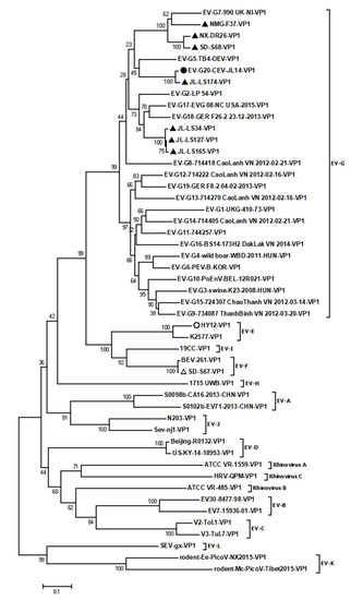 - Chang, X.; Lin, Q.; Hu, J.; Wang, X.; Li, X.; Cai, M.; Wang, W.; Zhang, Z.; Wang, X. Discovery of a virus of the species Enterovirus F in goats. Arch. Virol. 2019, 164, 2551–2558. [Google Scholar] [CrossRef]