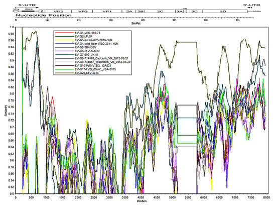 Recombination analyses of JL-LS34 with EV-G. Each curve is a comparison between the genome being analyzed and a reference genome. The horizontal bar above the curves is an illustration of the enterovirus genome. Each point plotted is the percentage identity within a sliding window 200 nt wide centered on the position plotted, with a step size of 20 nt between points.