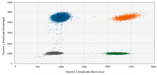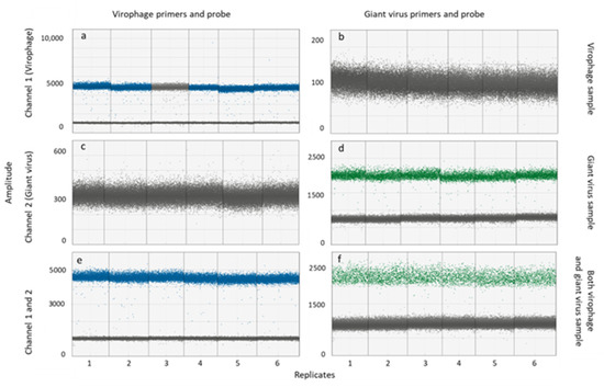 The ddPCR method is based on the generation of thousands of monodisperse droplets in which the PCR reactions take place. Each droplet has a probe-specific fluorescence signal that depends on the presence or absence of the DNA template. Therefore, each droplet is rated positive or negative depending on the fluorescence amplitude. On this basis, the fraction of positive droplets representing the target DNA sequence is calculated as DNA copies mL−1 based on the known total amount of droplets generated. Results from singleplex and multiplex tests confirmed that the primers amplified the target without cross-amplification, and that the probes annealed only to giant virus or to virophage templates, respectively, (Figure 1a–d and Figure 2). When the giant virus and virophage templates were mixed, amplification was successful, as indicated by band separation (Figure 1e,f). Specifically, blue and green bands represent the positive droplet signal for the giant virus and the virophage, respectively, while grey bands represent the negative droplet with no fluorescence signal. We used 2D-scatter plots (Figure 2) to evaluate the multiplex test, and found that the droplets separated into four groups: droplets containing either virophage or giant virus amplicons, droplets containing both amplicons, and droplets without amplicons. Thus, the primers and probes were giant virus- and virophage-specific when multiplexed, and cloud separation in the 2D-scatter plots enabled the quantification of the giant virus and of the virophage.