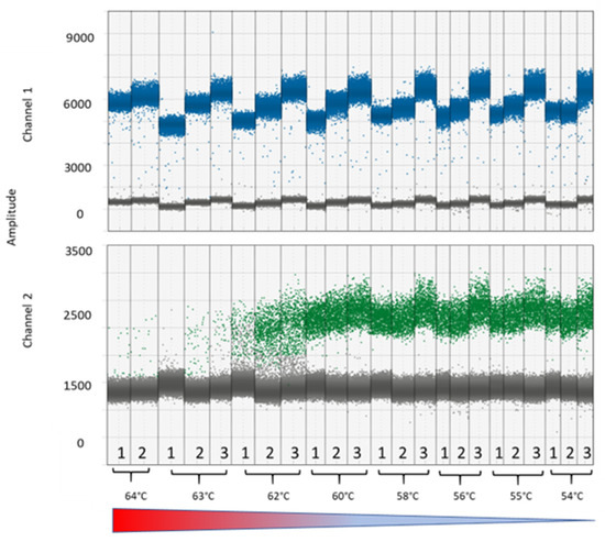 We found that the virophage signals separated well when using annealing temperatures (Tann) between 54 °C and 64 °C, while band separation for the giant virus occurred only at Tann < 62 °C (Figure 3). Average counts in the Tann range where band separation was observed for both virus and virophage were 53.9 ± 1.0 virophage copies µL−1 and 7363 ± 203 giant virus copies µL−1, indicating similar counts across temperatures. Count differences among the replicates were related to sample preparation, which was done in cartridges where eight samples at a time could be prepared. Each replicate was prepared in a different cartridge, which could explain the variation in counts. We chose Tann = 58 °C for the following assays, as band separation for both the giant virus and the virophage was good at this temperature, and higher temperatures minimized unspecific PCR amplification.