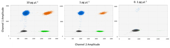Testing for the optimal DNA template concentration, we found that 1 pg µL−1 resulted in optimal droplet separation and lower double positive droplets where both targets were detected simultaneously (orange cloud, ~2% of total droplets) (Figure 4). The higher DNA concentration (10 pg µL−1) also showed good band separation, but the number of double positive droplets was higher (~5% of total droplets) compared to the intermediate concentration (~2% of the droplets). DNA concentrations of 0.1 pg µL−1 were too low to produce sufficient positive counts for accurate quantification. Both 1 pg µL−1 and 10 pg µL−1 DNA template concentrations provided good band separation, therefore DNA concentrations within this range are suitable for quantification. However, we choose 1 pg µL−1 as the optimal concentration to prevent oversaturation of DNA concentration and compromised band separation.