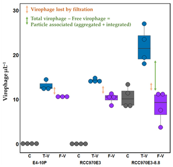 Virophage ddPCR-based quantification. Shown are copy number concentrations (virophage µL−1; median, 4 replicates) for host strains without integrated virophage (E4-10P, RCC970E3) and with integrated virophage (RCC970E3-8.8). Control (C; grey): host strain with no virophage added, no filtration before DNA extraction; Total-Virophage (T-V, blue): host and virophage, no filtration before DNA extraction; Free-Virophage (F-V, purple): filtered sample of host and virophage before DNA extraction.