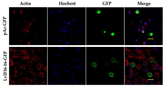 The pAc-GFP plasmid was constructed to express a green fluorescent protein in S2 cells and showed ubiquitously distribution in the cytoplasm and the nucleus (as a control) (Figure 3). The GFP-tagged LvIFI6-16 plasmid was obtained by inserting the full-length ORF of LvIFI6-16 into the pAc-GFP plasmid. The GFP-tagged LvIFI6-16 protein was visualized in plasmid transfected S2 cells by a confocal laser scanning microscope. LvIFI6-16 was dispersedly presented in the cytoplasm but rarely in the nucleus, suggesting that LvIFI6-16 was a cytoplasm localized protein (Figure 3).