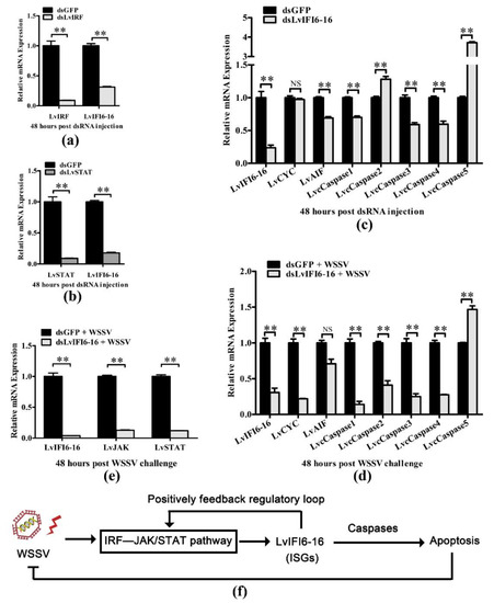 The regulatory effects between LvIFI6-16 and LvIRF, LvJAK, LvSTAT, or apoptosis-related genes before and after WSSV infection. (a) The transcription level of LvIFI6-16 in gills was regulated by LvIRF. (b) The transcription level of LvIFI6-16 in gills was regulated by LvSTAT. The internal control was LvEF-1α. Samples were taken at 48 h after dsLvIRF, dsLvSTAT, and dsGFP (as a control) injection. Bars indicated the mean ± SD of three samples and statistical significances were calculated by the Student’s t-test (** p < 0.01). (c) Transcription levels of apoptosis-related genes in gills of LvIFI6-16-knockdown shrimps. The internal control was LvEF-1α. Samples were taken at 48 h after injection with indicated dsRNA. Bars indicated the mean ± SD of three samples and statistical significances were calculated by the Student’s t-test (** p < 0.01; NS, not significant). (d) Transcription levels of apoptosis-related genes in gills of LvIFI6-16-knockdown shrimps after WSSV challenge. The internal control was LvEF-1α. Shrimps were injected with dsRNA of LvIFI6-16; after that, shrimp were infected with WSSV and samples were taken 48 h after WSSV infection. Bars indicated the mean ± SD of three samples and statistical significances were calculated by the Student’s t-test (** p < 0.01; NS, not significant). (e) LvIFI6-16 regulated the expression of LvJAK and LvSTAT in gills during WSSV infection. Samples were taken as described to (d). (f) A possible model of the LvIFI6-16 involving signaling regulation in response to WSSV infection. Pathogenic infection such as WSSV induced the activation of the IRF–JAK/STAT axis that triggered the expression of LvIFI6-16, which then resulted in the induction of several caspases that conferred antiviral apoptosis against WSSV. In addition, there could be a feedback regulatory loop mediated by LvIFI6-16 and JAK/STAT pathway. Bars indicated the mean ± SD of three samples and statistical significances were calculated by the Student’s t-test (** p < 0.01). Experiments were performed three times with similar results.