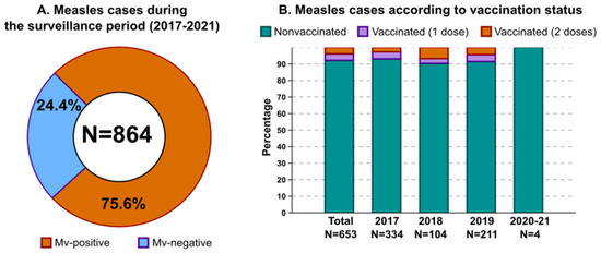 Measles cases in Milan and its surroundings (Northern Italy) during the years 2017–2021. (A) The proportion of measles cases identified during the study period. (B) The proportion of measles cases according to vaccination status and year of sample collection.
