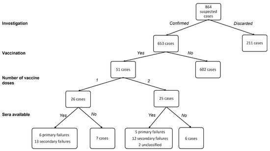 For a subgroup of 38 (74.5%) of the 51 vaccinated cases, a serum sample collected during the acute phase was available; for 36 of these, it was possible to distinguish between primary and secondary vaccine failures (Figure 2).