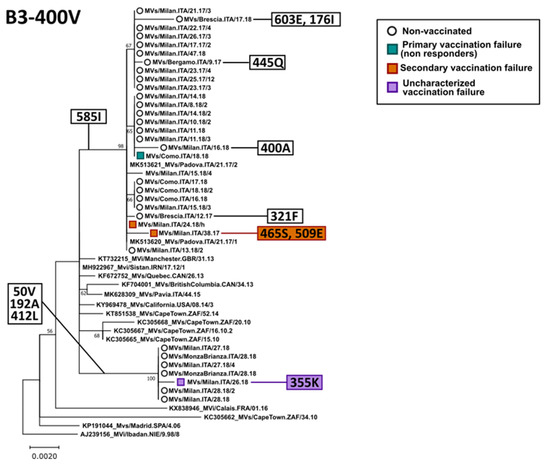 Phylogenetic analysis of genotype B3 H nucleotide sequences belonging to clade B3-400V. The tree was obtained with the maximum-likelihood method [32], based on the Kimura 2 parameters model [33], identified as the best-fitting model after the model test analysis, using MEGA 11 [28]. A discrete Gamma distribution was used to model the evolutionary rate differences among sites (+G = 0.1) and branch support (100 bootstrap iterations [29]) is provided next to nodes. The tree was built using full-length sequences and the phylogenetic placement of a few partial sequences was manually placed on the tree based on a separate phylogenetic analysis with partial H genes [23]. Strain MVi/Ibdan.NIE/9.98/8 was used as an outgroup. Sequences from Lombardy are indicated by an empty circle for non-vaccinated individuals or a square shape for vaccinees (green: primary vaccination failure, orange: secondary vaccination failure, and purple: uncharacterized vaccination failure). Amino acid mutations associated with branches, including studied strains, are indicated in white boxes on the left, while those identified in single strains are indicated on the right by white, green, or orange boxes for non-vaccinated, primary, and secondary vaccination failure, respectively.