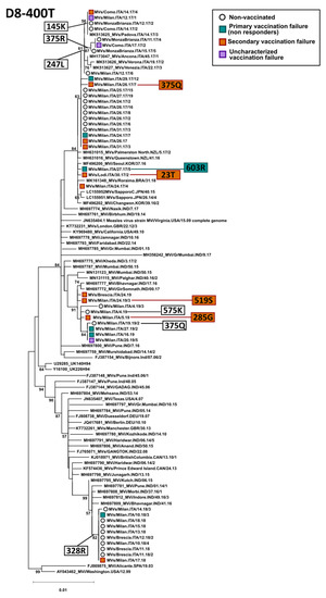 Phylogenetic trees built on these sequences showed that, for both B3 and D8 genotypes, sequences from Lombardy could be included in various clades, independently from the vaccination status (Figure 3 and Figure 4). These corresponded to the various genetic strains circulating in Lombardy in the different years, as we also showed previously [23,26]. Additionally, comparing the amino acid sequences of strains within each clade did not result in the identification of specific mutations that could be associated to immune escaping, considering both non-responders and cases of secondary vaccination failure. In fact, in most cases, sequences from vaccinees were identical or nearly identical to sequences from non-vaccinated subjects and we could not identify a specific mutation pattern in viruses identified in vaccinees. Finally, only 1 (247 L) of the identified mutations was included in one of the five immune epitopes [23].