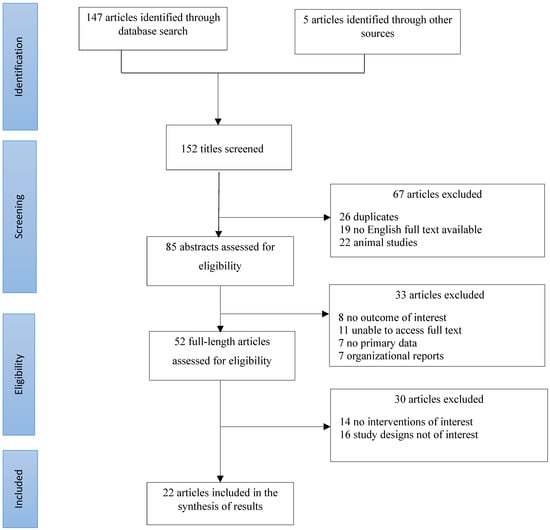 Our initial database search identified 147 titles that were screened. We further scrutinized other sources and identified an additional five studies that were publicly available but were not detected by our search. After a thorough review of the identified articles, 22 articles were used in this study. Data extracted included geographical location, the focus of interest, the timing of intervention implementation, population, methodology, and key findings including the reported arithmetic size of impacts (increase or decrease) and the corresponding confidence intervals or the ranges. In cases where the confidence intervals were not reported, we reported the numeric value of the impact size from the finding.