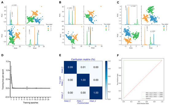 Performance of sequential AA-based CNN to predict the human adaptation of SARS-CoV-2 variants. (A–C) The performance of the sequential AA-based CNN model was assessed by the pair plot of PCA1 and PCA2 of the full connection layers from the CNN model post-training epochs of 10, 20, and 30 ((A–C) for training epochs of 10, 20, and 30, respectively); (D) The training loss for the CNN model was curved for 30 training epochs; (E,F) Confusion matrix (E), receiver operating characteristic curve (ROC) (F), and training ((D–F) for training epochs of 30). Statistical significance in the PCA1 or PCA2 values of the full connection layers between two neighboring adaptation groups is indicated, respectively, according to an unpaired, nonparametric Mann–Whitney test.