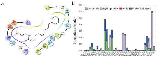 PEA interacts with SARS-CoV-2 S protein. (a) Binding mode of 6LZG with PEA after docking: “->” represents hydrogen bond interaction. (b) Amino acid residual interaction fractions in interaction with PEA.