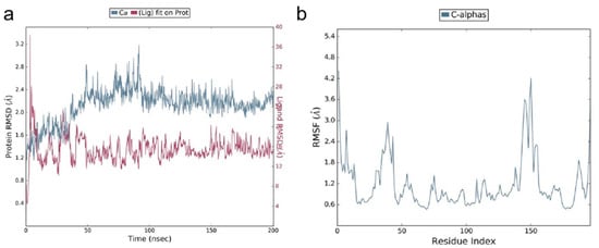 Molecular dynamic simulation study of RBD–PEA complex. (a) RMSD profile and (b) RMSF profile.