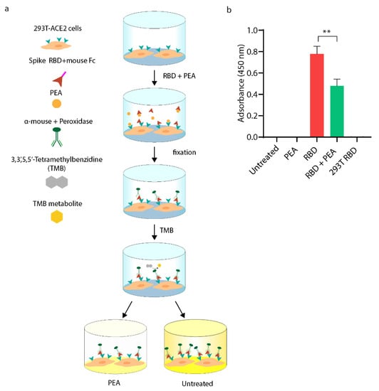 Cell-based ELISA assay performed on 293T-ACE2 cells. (a) Schematic illustration of experimental workflow. Briefly, 293T-ACE2 cells were exposed to equimolar concentrations of PEA (10 μM) and recombinant SARS-CoV-2 RBD fused with murine Fc. Then, cells were fixed and stained with peroxidase-labeled α-mouse IgG. (b) Statistical analysis of cell-based ELISA assay shown in a. Data are expressed as means ± SD and were analyzed by a one-way ANOVA (N = 4, α = 0.05, ** p < 0.001).