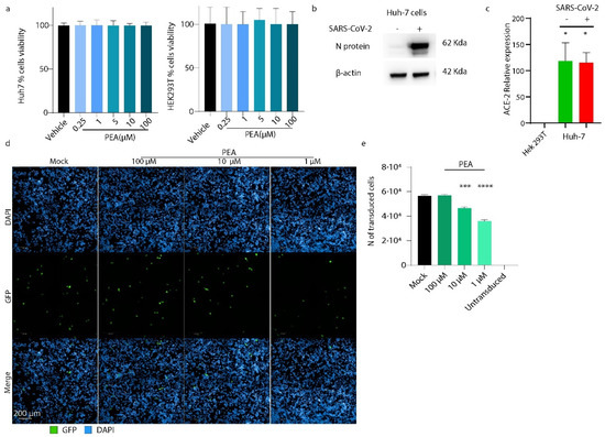 First, we tested PEA toxicity in both Huh-7 and 293T cells, as shown in Figure 4a. No toxicity was detected, even when PEA was present as high as 100 μM in both cell lines. Then, we confirmed the efficient infection of Huh-7 with SARS-CoV-2, which was known before [36]. As shown in Figure 4b,c, these cells can be efficiently infected by SARS-CoV-2 and express high levels of ACE-2 mRNA before and after viral infection.