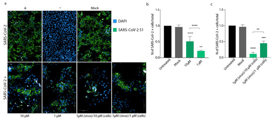 To confirm these results, we repeated the same experimental conditions using high-content confocal microscopy screening. Briefly, cells were seeded in 96-well plates, then treated or not with PEA at 1 or 10 μM and then infected with SARS-CoV-2, incubated or not with PEA at 1 μM. As shown in Figure 6a,b, pre-treatment with PEA at 10 and 1 μM reduced the number of infected cells by 48.8% (p < 0.01) and 78.5% (p < 0.001), respectively, compared to untreated cells. Interestingly, the combined treatment of PEA administered on both Huh-7 cells and SARS-CoV-2 reduced the number of infected cells by 55.02% (p < 0.0001) when PEA was administered at 1 μM, while PEA at 10 μM reduced the amount of infected cells by 89.8% (p < 0.0001) compared to controls (Figure 6c).