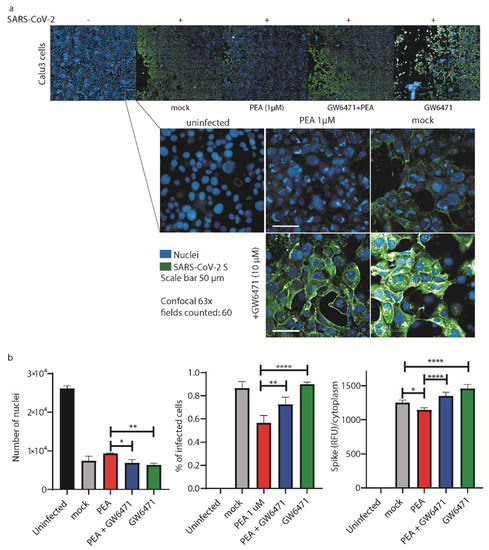 To further confirm the antiviral activity of PEA, we decided to perform the same analysis shown in Figure 6 on Calu-3 cells, another cell line that is widely used for SARS-CoV-2 infections [37]. As shown in Figure 7a, we performed high-content confocal microscopy screening on Calu-3 cells infected with SARS-CoV-2 mixed or not with PEA (1 μM). To better elucidate the mechanism of action of PEA as an indirect antiviral agent, we also added a potent antagonist of the PPAR-α receptor (GW6471) as a control. As shown in Figure 7a,b, PEA decreased the number of infected cells together with the intensity of expression of SARS-CoV-2 S protein. On the contrary, the administration of GW6471 increased the amount of SARS-CoV-2 S protein, detected as relative fluorescence units (RFU), compared to the PEA-treated or mock counterparts.