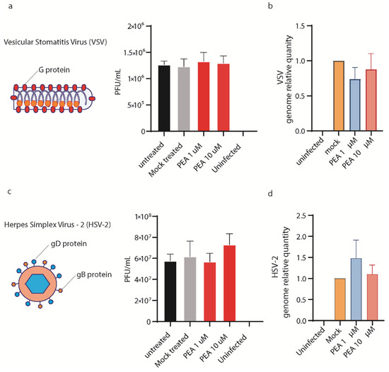 To probe the specificity of PEA antiviral activity, we exposed vesicular stomatitis virus (VSV) and herpes simplex virus-2 (HSV-2) to PEA at 1 and 10 μM for 30′. Both viruses use different glycoproteins to mediate viral entry, recognizing different cellular receptors compared to SARS-CoV-2. Moreover, the replication of both viruses follows two distinctive paths that differ from the one used by SARS-CoV-2. As shown in Figure 9a–d, PEA did not affect viral entry for either virus, measured as plaque forming units/mL or the qRT-PCR quantification of viral genomes in the supernatants. These results corroborate the hypothesis that PEA binding is specific for SARS-CoV-2 S protein.