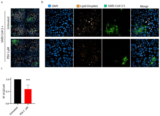 We hypothesized that the antiviral activity of PEA administered to cells might also depend on the activation of PPAR-α. Indeed, PPAR-α generates a signaling cascade that leads to the disruption of lipid droplets by the activation of β-oxidation within mitochondria and peroxisomes, and the concomitant stimulation of omega-oxidation in microsomes [38]. LDs, indeed, are required by SARS-CoV-2 to fuel its replication. To probe our hypothesis, PEA was administered to Huh-7 cells prior to infection. Then, cells were fixed and stained with Oil Red O to mark LDs. The quantification of the LD content/cell by high-content confocal microscopy revealed that the administration of PEA at 5 μM drove a reduction in LD numbers by 40.3% (p < 0.001) in SARS-CoV-2 cells compared to their untreated counterparts (Figure 10a–c).
