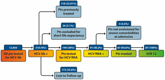 An opportunistic hospital screening and referral model was conducted throughout all divisions of the Evangelic Hospital Betania of Naples from January 2020 to May 2021. The presence of HCV antibodies (HCV-Ab) was tested as a routine standard of care in all consecutive patients admitted to the hospital in different divisions (ordinary hospitalization, day hospital, and day surgery), regardless of the reason for being hospitalized.