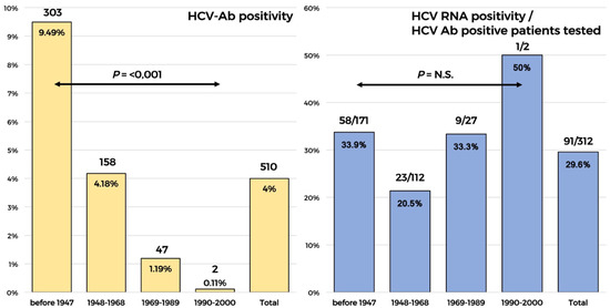 The distribution of active infections by HCV-Ab positivity according to the birth cohort is shown in the Figure 2. Overall, HCV-Ab positivity was 4%. It was significantly higher in older ages and decreased significantly in younger ages (birth cohorts after 1968), whereas among the available patients in whom the HCV-RNA confirmation was required, the rate of active infection among patients positive for HCV-Ab was 29.6%. The rate of active infection was not significantly different between the birth cohorts. However, we found a slightly higher rate of HCV RNA in the 1969–1989 birth cohort compared to the 1968–1948 one (33% vs. 22%) and a rate of 33% of active infection in patients older than 80 years.