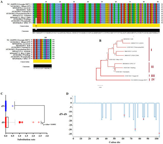 - Weaver, S.; Shank, S.D.; Spielman, S.J.; Li, M.; Muse, S.V.; Kosakovsky Pond, S.L. Datamonkey 2.0: A Modern Web Application for Characterizing Selective and Other Evolutionary Processes. Mol. Biol. Evol. 2018, 35, 773–777. [Google Scholar] [CrossRef]