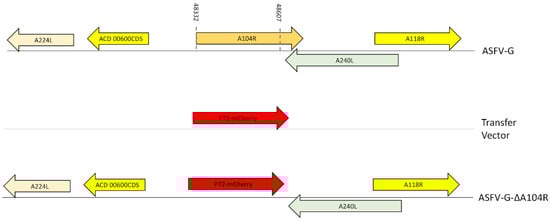 Schematic for the development of ASFV-G-∆A104R. The transfer vector contains the p72 promoter and an mCherry cassette; the gene positions are indicated. The homologous arms were designed to have flanking ends to both sides of the deletion/insertion cassette. The nucleotide positions of the area that was deleted in the ASFV-G genome are indicated by the dashed lines. The resulting ASFV-G-∆A104RL virus with the cassette inserted is shown on the bottom.