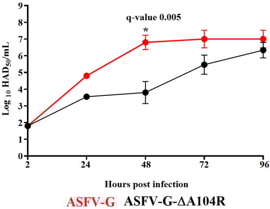 In vitro growth kinetics in primary swine macrophage cell cultures for ASFV-G-∆A104R and parental ASFV-G (MOI= 0.01). Samples were taken from three independent experiments at the indicated time points and titrated. Data represent means and standard deviations of three replicas. Sensitivity using this methodology for detecting virus is ≥log10 1.8 HAD50/mL. (*) Indicates significant differences.