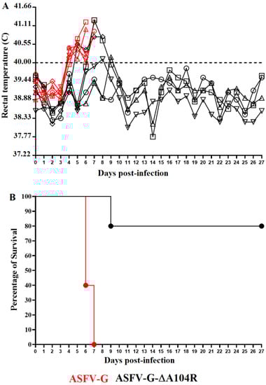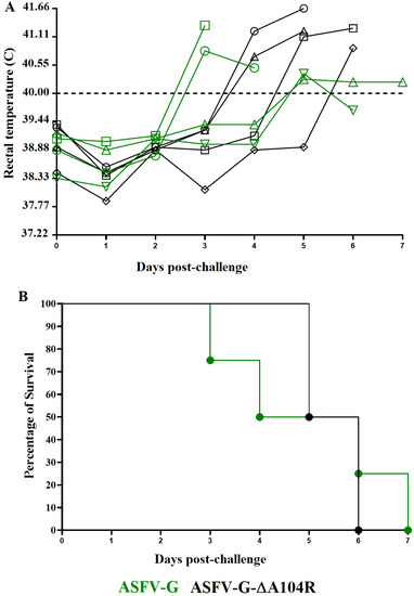 Evolution of body temperature (A) and mortality (B) in animals (5 animals/group) IM infected with 102 HAD50 of either ASFV-G-∆A104R or parental ASFV-G.