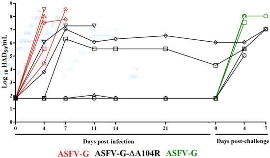 Viremia titers detected in pigs IM inoculated with 102 HAD50 of either ASFV-G-∆A104R (filled symbols), or ASFV-G (empty symbols). Each symbol represents the average of animal titers in each of the groups. Sensitivity of virus detection: >log10 1.8 TCID50/mL.