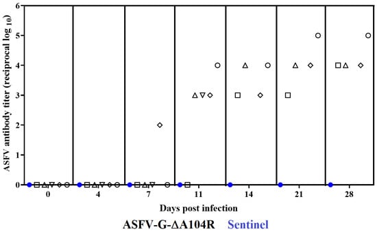 Replication in the animals of either ASFV-G-∆A104R or ASFV-G was evaluated by measuring viremia titers throughout the 28-day experimental period (Figure 5). As expected, viremias in animals inoculated with parental ASFV-G had high titers (ranging from 104.55–108.55 HAD50/mL) at day 4 pi, remaining high until the day all animals were euthanized. Viremias in animals inoculated with ASFV-G-∆A104R presented a heterogeneous pattern. The animal which developed a lethal disease showed high virus titers (106 HAD50/mL) by day 4 pi, with increasingly higher titers (107.33 HAD50/mL) until it needed to be euthanized due to the severity of the clinical disease. Two of the other animals that survived the infection showed just a transitory peak of body temperature, with viremias peaking by day 7 pi (with titers of 106–107 HAD50/mL). They kept similar viremia until day 28 pi. The other two remaining animals showed almost undetectable viremia values until day 28 pi (Figure 5). Therefore, ASFV-G-∆A104R, along with showing an attenuated phenotype, produced in the inoculated animals very heterogeneous patterns of viremia that do not correlate with the presence of clinical signs of ASF. This is not unique to ASFV-G-∆A104R, since it has also been seen with other attenuated strains we have produced in our laboratory [,,,].