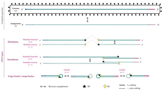 The types of DVG frequently considered have been deletions and copy- and snap-backs (Figure 1) but insertions and rearrangements with the host’s mRNAs should not be discarded. Although the terminology is not yet completely unified, the DVGs can be characterized by three parameters: the genome position at which the RdRp is released from the template or break-point (BP); the genome position at which the RdRp reattaches to the template and continues polymerizing; or the reinitation site (RI) and the sense of the fragments pre- and post-BP/RI junction (Figure 1).