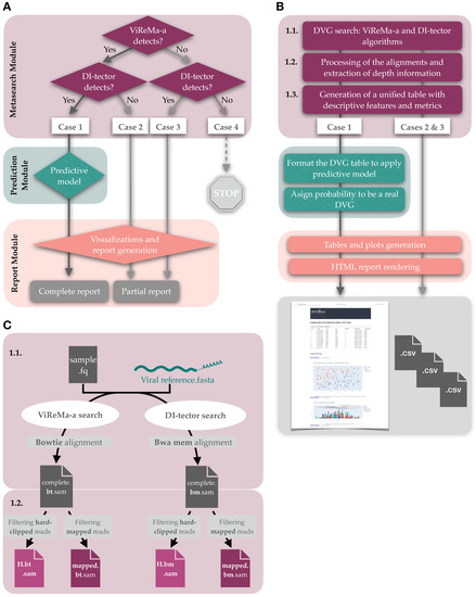 The program is structured in three modules acting sequentially (Figure 2): (1) Metasearch module—launches the search of DVGs in the HTS data with the ViReMa-a and DI-tector algorithms. The program then extracts the structural DVGs identified by the search algorithms and characterizes them by generating informative variables with a unified terminology (see below). (2) Prediction module—applies the trained classification model to the set of identified DVGs and assigns each DVG a probability of being a true positive. (3) Report module—writes final tables, prepares the graphic visualizations, and wraps up everything into an HTML final report.