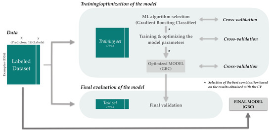 A Gradient Boosting Classifier (GBC) was chosen to build the predictive model using the methods implemented by the scikit-learn library [36] and following the DOME recommendations for supervised ML validation in biology [37]. Before selecting this algorithm, we tested several combinations of algorithms and number of predictors and choose the current one based on its best scores in accuracy, precision, F1 score, receiver operating characteristic curve (ROC), and the area under the ROC curve (AURC). Figure 3 summarizes the process.