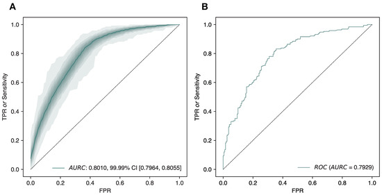 ROC curves of the optimized classifier (GBC algorithm). (A) Four-fold cross validation (100 repeats each fold) in the training set partition; the mean ROC is shown with a continuous line and the distribution of the data from 45–55 to 0–100 percentiles in ranges of 5% in the colored areas (from darker to lighter respectively). A mean AURC = 0.8010, with a 99.99% CI from 0.7964 and 0.8055, was achieved in the training set. (B) Final validation of the model in the test partition. Despite these data being completely new for the model, the AURC = 0.7929 was really close to the values of the training set, thus considering the model to be generalizable. The final model was trained with the whole dataset.