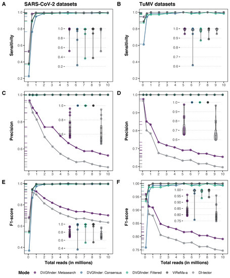 The results obtained in terms of precision in both datasets are equivalent. The ViReMa-a, DVGfinder Filtered, and DVGfinder Consensus run modes achieved maximum precision on all samples, regardless of library size (Figure 5C,D). DI-tector shows a decay in precision with increasing sample size; consequently, DVGfinder Metasearch follows shows the same behavior although to a lesser extent due to the contribution of ViReMa-a.