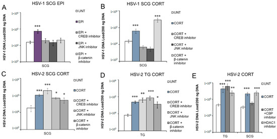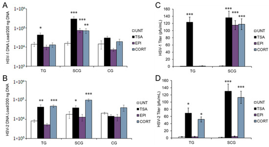 Neither EPI nor CORT were able to induce HSV-1 reactivation in sensory TG or para-sympathetic CG neurons. However, both EPI and CORT induced HSV-1 reactivation in sympathetic SCG neurons, as shown by significantly increased viral DNA compared to untreated latently infected neurons (UNT; ACV removed but no other treatment) (Figure 1A). Trichostatin A (TSA), a nonspecific histone deacetylase (HDAC) inhibitor that has previously been shown to reactivate HSV-1 reliably from latency [30,33,34], was used as a positive reactivation control. Although EPI and CORT both induced HSV-1 reactivation in sympathetic neurons, viral DNA did not reach the same quantity as TSA-induced reactivation, suggesting that stress hormone-induced reactivation may not be as strong of a stimulus as some other reactivation stimuli. In contrast, CORT induced reactivation of HSV-2 in both sensory TG and sympathetic SCG neurons (Figure 1B), but EPI had no effect on HSV-2, regardless of neuron type. Although we also observed a trend of increased HSV-2 DNA in parasympathetic CG neurons following CORT treatment, neither EPI nor CORT had a statistically significant effect on HSV-1 or HSV-2 in parasympathetic CG neurons. TSA produced a significant increase in HSV-1 and HSV-2 DNA in sensory TG and sympathetic SCG, but not in parasympathetic CG neurons (Figure 1A,B), suggesting that parasympathetic CG neurons may regulate HSV differently than sensory or sympathetic neurons.
