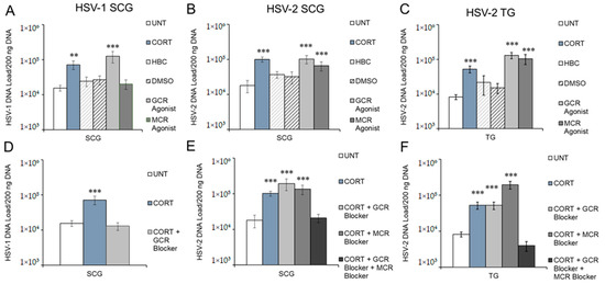 Cortisol, a glucocorticoid secreted by the adrenal cortex, induces a “long-term” stress response. Cortisol binds to glucocorticoid (GR) and mineralocorticoid receptors (MR), and its major effects on humans and mammals include regulation of metabolism and suppression of the immune system. Cortisol (corticosterone in rodents) induces HSV-1 and HSV-2 reactivation in vivo, which is presumed to occur through immune system suppression [20,21]. However, stress-induced transcription factors expressed in sensory TG neurons stimulate the HSV-1 ICP4, ICP27, and ICP0 promoters [22,23,24,25,26], and ICP0 alone can initiate reactivation of HSV-1 from latency [27,28,29]. In addition, we previously demonstrated that corticosterone (CORT) modulates acute HSV-1 and HSV-2 replication during productive infection in sympathetic but not sensory neurons [16]. Thus, CORT may potentially induce HSV reactivation by acting directly on neurons that harbor latent virus, rather than acting through immune system suppression.