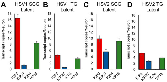 During latency, we detected low levels of expression of ICP0, ICP27, and VP16 in both HSV-1- and HSV-2-infected sensory and sympathetic neurons, shown as number of transcripts per neuron (Figure 4). Although expression level varied depending upon HSV type and the neurons in which the viruses established latency, the general pattern of expression was similar (Figure 4). ICP0 was the most highly expressed (4.5–16.5 transcripts/neuron), followed by VP16 (3.4–9.1 transcripts/neuron). ICP27 was more highly expressed by HSV-2 (2.7–5.6 transcripts/neuron; Figure 4C,D) than HSV-1 (0.5–1.3 copies/neuron; Figure 4A,B). In contrast, ICP4 showed negligible expression in both TG and SCG neurons during latency (Figure 4A–D). For comparison and to demonstrate latency, we also detected up to 70.65 copies of the latency-associated transcript (LAT) per neuron.