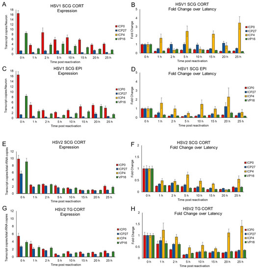 HSV gene expression in primary SCG and TG neuronal cultures during EPI- and CORT-induced reactivation. Primary adult neuronal cultures from sympathetic SCG and sensory TG infected with HSV-1 or HSV-2 for 7 days in the presence of acyclovir to establish latency were treated with epinephrine (EPI) or corticosterone (CORT) to induce reactivation. Total RNA was extracted at the designated timepoints post-reactivation, and viral gene transcripts for ICP0, ICP27, ICP4, and VP16 were quantified by ddPCR. (A) HSV-1 in SCG treated with CORT, presented as gene transcript copies per neuron. (B) HSV-1 in SCG treated with CORT, presented as fold-change compared to each gene expressed during latency with no treatment and no removal of acyclovir (0 h). (C) HSV-1 in SCG treated with EPI, as gene transcripts per neuron. (D) HSV-1 in SCG treated with EPI, as fold-change compared to each gene expressed during latency (0 h). (E) HSV-2 in SCG treated with CORT, as gene transcript copies per neuron. (F) HSV-2 in SCG treated with CORT, as fold-change compared to each gene expressed during latency (0 h). (G) HSV-2 in TG treated with CORT, as gene transcripts per neuron. (H) HSV-2 in TG treated with CORT, as fold-change compared to each gene expressed during latency (0 h). Data are means ± SEM, n > 6 experiments.