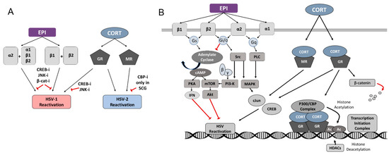 Adrenergic and glucocorticoid signaling pathways and HSV reactivation pathways. (A) Epinephrine (EPI) induces HSV-1 reactivation through the activation of α2 and any other AR, or through the activation of β1 and β2, which can be blocked by the inhibitors of CREB, JNK, or β-catenin. Corticosterone (CORT) induces HSV-1 reactivation through the glucocorticoid receptor (GR), which can be blocked by the inhibitors of CREB or JNK. CORT induces HSV-2 reactivation through either glucocorticoid (GR) or mineralocorticoid (MR) receptors; the only factor we identified able to block HSV-2 reactivation was a CBP inhibitor, and only in SCG neurons. (B) Epinephrine (EPI) activates multiple adrenergic receptors on peripheral neurons (α1, α2, β1, β2), which couple with different G-protein α subunits (Gq, Gi/o, Gs), which can activate different signaling cascades. Corticosterone (CORT) activates signaling cascades through cytosolic glucocorticoid (GR) and mineralocorticoid (MR) receptors. Cytosolic effector proteins and transcription factors mediated by EPI and CORT signaling include adenylate cyclase, cyclic AMP (cAMP), protein kinase A (PKA), interferons (IFN), the mechanistic target of rapamycin (mTOR), protein kinase B (Akt), protein kinase Src, phosphoinositide 3-kinase (PI3-K), phospholipase C (PLC), mitogen-activated protein kinases (MAPKs), c-Jun, cAMP response element-binding protein (CREB), CREB binding protein (CBP), p300/CBP Complex, histone deacetylases (HDACs), and β-catenin. Black arrows indicate stimulation or activation; red arrows indicate inhibition.