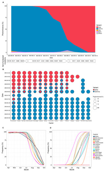 Since December 2019, the world has faced one of the most challenging infectious diseases in decades [31]. The SARS-CoV-2 has spread worldwide, causing significant socioeconomic and health impacts on a global scale [32]. In Brazil, the devastating effects of the pandemic were no different. Brazil is the largest country in Latin America, with continental dimensions that pose challenges of comparable sizes, such as the difficulty of adopting unitary policies to confront and monitor the COVID-19 pandemic [33]. These problems can be better managed with national epidemiologic surveillance programs, which provide data that allow preventive and effective public health policies. In this context, we evaluated the epidemiological dynamics of SARS-CoV-2 variants from 15 different Brazilian capitals between April and October 2021.