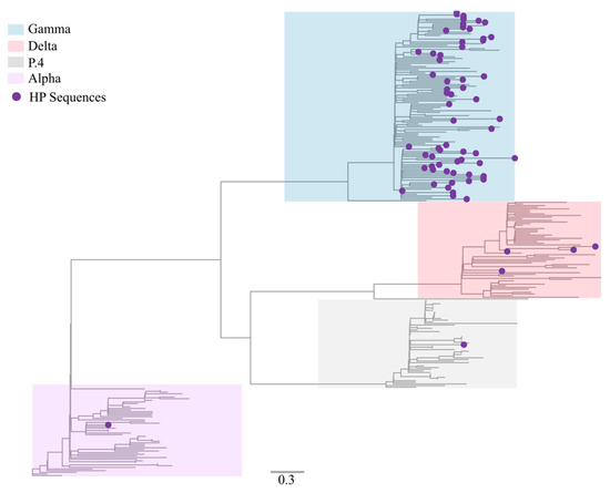 In total, 69 samples with a non-characteristic genotypic profile by RT-qPCR genotyping were sequenced and characterized in this study. Median genome coverage of 95.71% (73.39 to 99.82%) and sequencing depth of 944.4×–2508.8× (median: 957.5×). The sequences, initially analyzed by Pangolin and NextClade tools, were classified as Gamma (P.1) (91.30%; 63/69), Alpha (B.1.1.7) (1.45%; 1/69), P.4 (1.45%; 1/69), and Delta (B.1.617.2) (5.79%; 4/69). Sequencing metrics and the pangolin/nextclade classification are available in Supplementary Table S3. We performed a maximum likelihood phylogeny to corroborate the data found in Pangolin and Nextclade classification. Our phylogenetic analysis confirmed that the novel genomes were correctly classified among VOCs Alpha, Gamma, Delta, and variant P.4 (Figure 3).