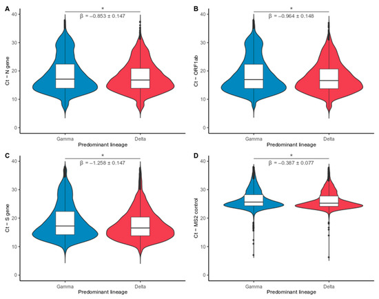 Ct data were evaluated from 61,815 patients who had positive RT-qPCR results for SARS-CoV-2 RNA, collected in 15 Brazilian capitals between 1 April and 31 October 2021. The Ct values were obtained from the amplification of three distinct viral targets (N, ORF1ab, and S genes of SARS-CoV-2), in addition to internal process control used here as a virus-independent variable (MS2), with the TaqPath COVID-19 CE-IVD RT-PCR kit (Thermo Fisher, Waltham, MA, USA) according to manufacture’s instructions. Samples were anonymized and categorized into Gamma or Delta groups when a given lineage exhibited frequency above 90% at the time of collection to estimate differences in the distribution of Ct values in periods dominated by different VOCs. The dominance period was defined for each capital: Belém (Gamma: 1 April 2021–16 June 2021; Delta: 1 October 2021–31 October 2021), Belo Horizonte (Gamma: 4 January 2021–31 July 2021; Delta: 1 September 2021–31 October 2021), Brasília (Gamma: 4 January 2021–15 June 2021; Delta: 1 September 2021–31 October 2021), Fortaleza (Gamma: 4 January 2021–15 July 2021; Delta: 1 October 2021–31 October 2021), Goiânia (Gamma: 4 January 2021–15 July 2021; Delta: 16 September 2021–31 October 2021), Palmas (Gamma: 4 January 2021–15 June 2021; Delta: 16 September 2021–31 October 2021), Porto Alegre (Gamma:4 January 2021–15 July 2021; Delta: 1 September 2021–31 October 2021), Porto Velho (Gamma: 4 January 2021–15 June 2021; Delta: 16 October 2021–31 October 2021), Rio de Janeiro (Gamma: 4 January 2021–15 June 2021; Delta: 16 August 2021–31 October 2021), and São Paulo (Gamma: 4 January 2021–15 July 2021; Delta: 16 September 2021–31 October 2021). Data from periods with intermediate frequency and data from capitals in which the Delta VOC did not reach the established dominance cut-off were not analyzed. The lineage effect on the Ct score was estimated at the national level and for each capital using a linear regression model, and results were plotted on graphs using the ggplot2 [18] packages of the R software (R version 4.1.1; R Foundation for Statistical Computing, Vienna, Austria). Dataset and code used are available on Supplementary File S3.