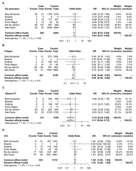 Data available in the Severe Acute Respiratory Syndrome (SRAG) database (https://opendatasus.saude.gov.br/dataset/bd-srag-2021, accessed on 11 November 2021) were explored to assess patterns of relevant symptoms from 1 April to 31 October 2021. We selected 9814 registries that simultaneously met the following criteria: (i) samples from unvaccinated individuals, (ii) confirmation of COVID-19 diagnosis by RT-qPCR, and (iii) complete registration information. Records were collected from 15 Brazilian capitals, and the data were divided into two main groups Gamma (control) and Delta (case) groups. Each group was composed of patients’ clinical data corresponding to the period in which the variant represented at least 90% of the other variants in the capital. We were able to retrieve the following clinical data: fever, cough, sore throat, O2 saturation, fatigue, dyspnea, respiratory distress, diarrhea, vomiting, abdominal pain, loss of smell, loss of taste, need for ventilatory support, altered computed tomography of chest result, altered X-ray of chest result, intensive care unit (ICU) admission, and death. The meta-analysis (random and common effects) and the heterogeneity among capitals were calculated using the meta-package in R software (R version 4.1.1; R Foundation for Statistical Computing, Vienna, Austria). Dataset and code used are available on Supplementary File S4.