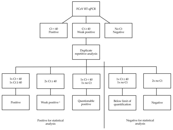 All fecal samples were examined for FCoV RNA load per gram (g) of feces by reverse transcriptase quantitative polymerase chain reaction (RT-qPCR) as described previously [33]. For this, total nucleic acid was extracted from fecal samples applying the “MagVet™ Universal Kit” (ThermoFisher, Darmstadt, Germany) on a KingFisher Flex Purification System platform (ThermoFisher, Darmstadt, Germany) according to the manufacturer instructions. RT-qPCR based on the FCoV 7b gene [33] was performed as a singleplex reaction. RT-qPCR was run with six quality controls, including RT-qPCR-positive controls, RT-qPCR-negative controls, negative extraction controls, an internal positive control (IPC) spiked into the lysis solution to monitor the nucleic acid extraction efficiency and presence or absence of inhibitory substances, RNA quality control, and an environmental contamination monitoring control [31]. Samples with a threshold cycle (Ct) value below 40 were considered positive. If RT-qPCR was initially weak positive (Ct ≥ 40), RT-qPCR was repeated in duplicate. Depending on the results of this duplicate repetitive analysis, results were then categorized (Figure 1).
