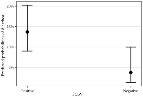 Five potential enteropathogens (FPV, FCoV, cpa, Ancylostoma tubaeforme, Salmonella enterica) were shown to have a potential association with diarrhea in both univariate analyses. Ancylostoma tubaeforme and Salmonella enterica showed the weakest association in univariate analyses (both p = 0.17) and did not show a significant association in the multivariate model (both p ≥ 0.17). Infection with FCoV, cpa, and FPV was significantly associated with an increased risk of having diarrheic feces in the multiple logistic regression (Table 4).
